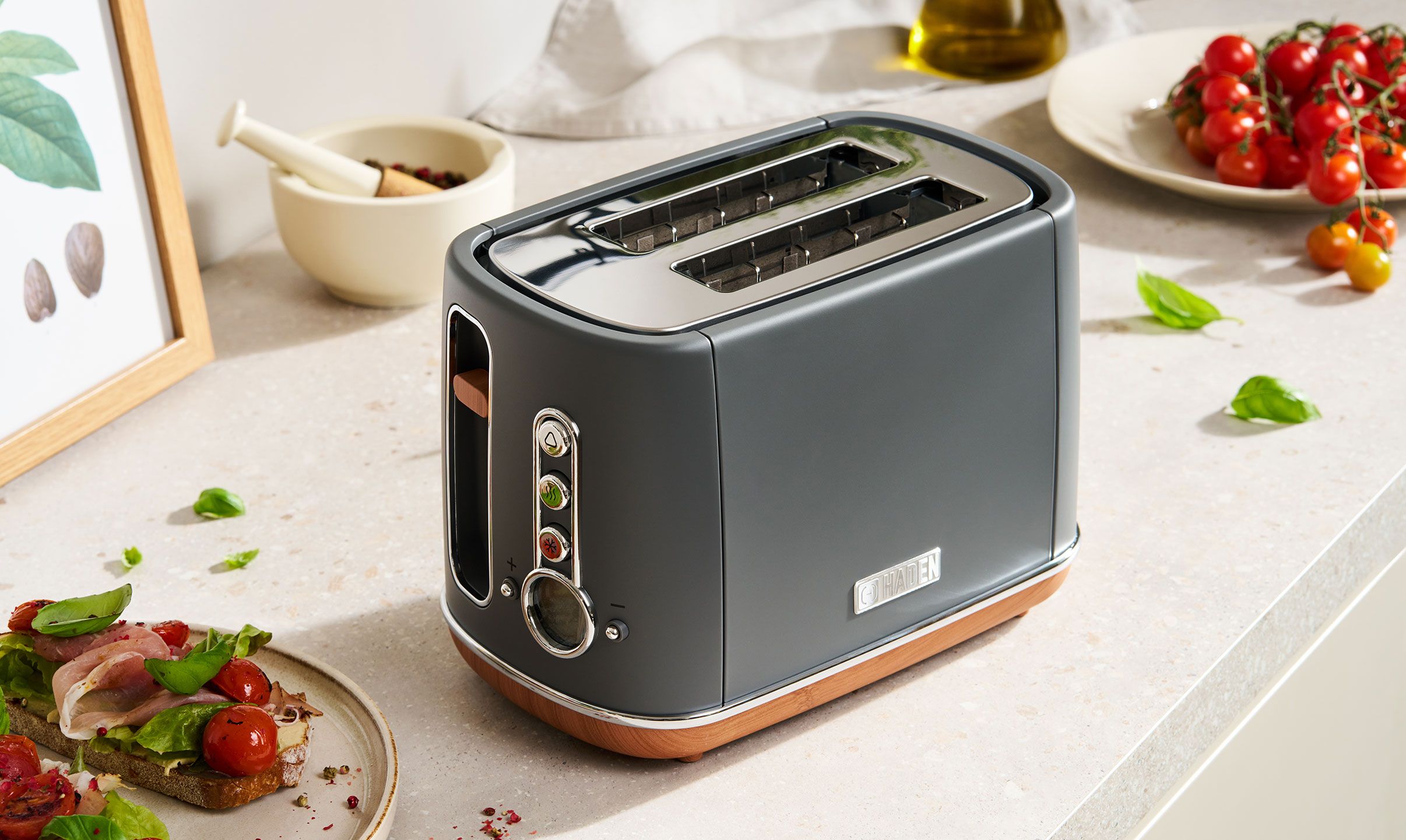 Szary toster Haden z linii Dorchester doskonale odnajdzie się w Twoim wnętrzu. Ponadczasowa kolorystyka oraz akcenty naśladujące naturalne drewno doskonale zgrają się z każdym wystrojem. Harmonijny design oraz stylowe i dopracowane detale sprawią, że funkcjonalne urządzenie zmieni się w wyjątkową ozdobę.