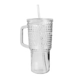 Szklanka BERE to idealne połączenie nowoczesnego designu i funkcjonalności. Jej transparentne szkło ozdobione jest eleganckim tłoczonym wzorem kropek, który dodaje lekkości i unikatowego charakteru. Z pojemnością aż 1 litra, uchwytem, pokrywką i szklaną słomką to świetny wybór na co dzień – zarówno do pracy, jak i na relaks na balkonie czy pikniku.