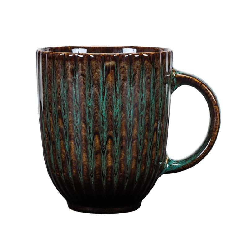 - Reaktywne szkliwo w odcieniach zieleni i brązu: Unikalne wzory i nieregularność dekoracji czynią każdy kubek wyjątkową dekoracją stołu.