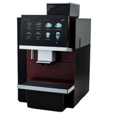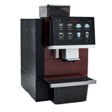 Elegancji ekspresowi dodaje szklany front oraz elementy w kolorze czarnym i bordowym. Smukła, symetryczna bryła z prostymi liniami i wąskimi ramkami wokół ekranu nadaje urządzeniu nowoczesny charakter, a matowe wykończenia pomagają ograniczyć widoczność odcisków palców. Dopracowane detale sprawiają, że F16 prezentuje się świetnie zarówno na recepcji, jak i w biurze czy strefie samoobsługowej, łatwo wpisując się w różne style wnętrz.