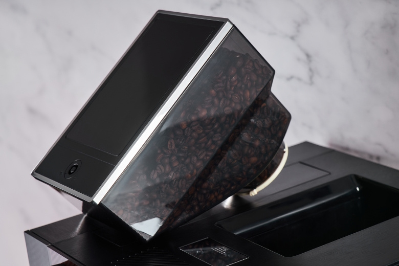 Elegancji ekspresowi dodaje szklany front oraz elementy w kolorze czarnym i bordowym. Smukła, symetryczna bryła z prostymi liniami i wąskimi ramkami wokół ekranu nadaje urządzeniu nowoczesny charakter, a matowe wykończenia pomagają ograniczyć widoczność odcisków palców. Dopracowane detale sprawiają, że F16 prezentuje się świetnie zarówno na recepcji, jak i w biurze czy strefie samoobsługowej, łatwo wpisując się w różne style wnętrz.