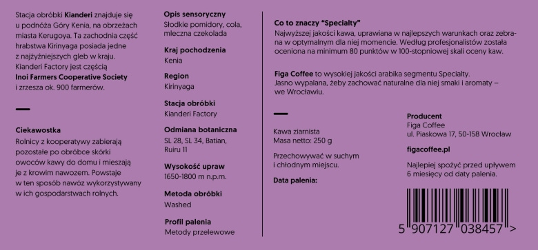 Figa Coffee Kenia Inoi Kianderi to jasno palona arabika specialty z Kenii przeznaczona do metod przelewowych. Ziarna pochodzą ze stacji Kianderi Factory, leżącej u podnóża Góry Kenia na obrzeżach Kerugoyi (hrabstwo Kirinyaga). Stacja jest częścią Inoi Farmers Cooperative Society i skupia około 900 drobnych plantatorów, którzy uprawiają kawę na wyjątkowo żyznych glebach wulkanicznych. Na kawę składają się ziarna odmiany SL 28, SL 34, Batian oraz Ruiru 11, które rosna na wysokości 1650-1800 m n.p.m.