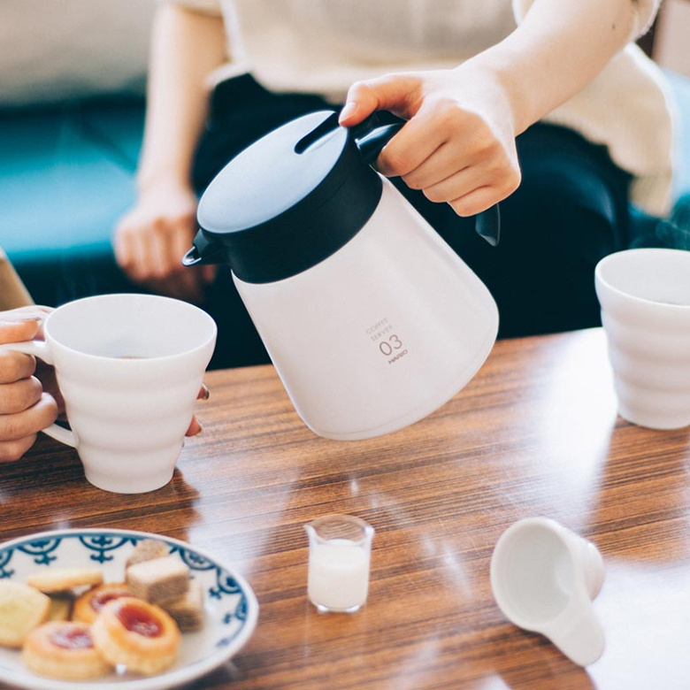 Hario V60 Heat-Retaining Server to stylowy i funkcjonalny dzbanek termiczny wykonany ze stali nierdzewnej w kolorze białym o pojemności 800 ml. Dzięki podwójnym ściankom doskonale utrzymuje temperaturę kawy.