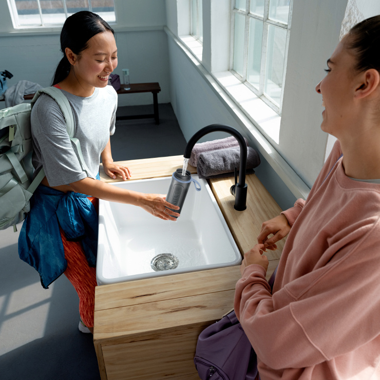 Ściśnij i pij - elastyczny korpus butelki BRITA Active działa jak bidon, a pasek pozwala przypiąć butelkę do plecaka czy torby. Możesz mieć ją zawsze pod ręką podczas biegu, trekkingu czy na siłowni.
