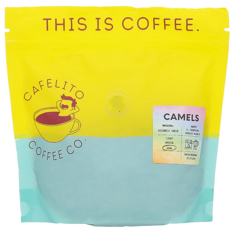 Cafelito Camels to ciemno palona mieszanka arabiki z Kolumbii (20%) oraz robusty z Indii (80%) przeznaczona do ekspresów ciśnieniowych i kawiarek. Jest to idealna mieszanka dla każdego, kto od kawy oczekuje prawdziwej intensywności i głębi smaku.