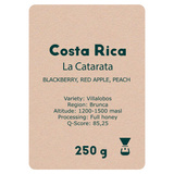 YoCo Coffee Costa Rica La Catarata to jasno palona arabika jakości specialty z Kostaryki przeznaczona do metod przelewowych. Jej ziarna odmiany Villalobos uprawiane są na wysokościach 1200-1500 m n.p.m. w regionie Brunca. Kawa została poddana obróbce Full honey, a w teście jakości SCA uzyskała 85,25 punktów.