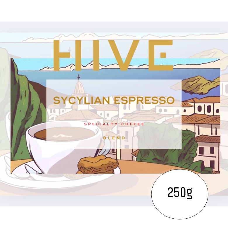 Hive Roasters Sycylian Espresso to ciemno palona mieszanka arabiki i robusty z Brazylii i Kolumbii, stworzona do ekspresów. Składają się na nią ziarna arabiki 60% z Brazylia (Mundo Novo, natural) oraz 30% arabiia z Kolumbii (Caturra, myta). Mieszankę wzbogaca brazylijska Robusta Conilon 10% (natural). Ziarna zostały uprawiane na wysokości 800–2000 m n.p.m.