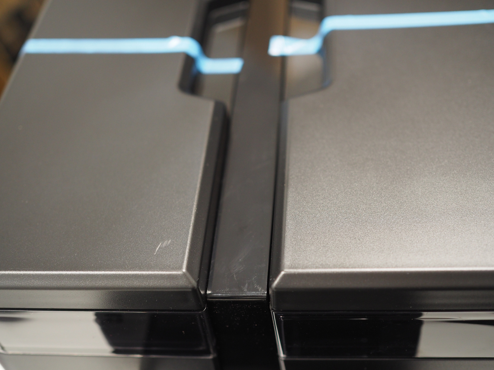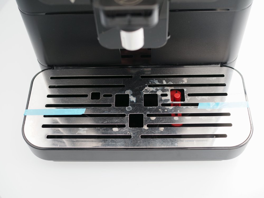 Ekspres posiada znaczne rysy widoczne na zdjęciach na następujących elementach: pokrywa zbiornika na wodę, krata tacy ociekowej.