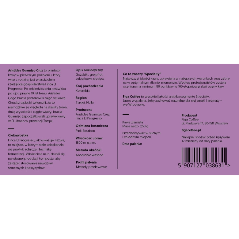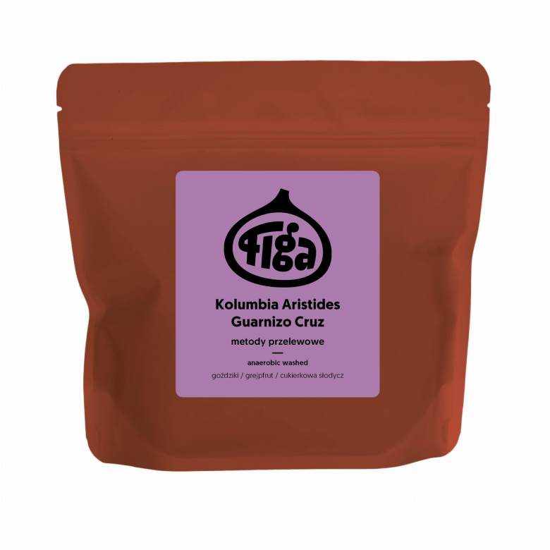Figa Coffee Kolumbia Aristides Guarnizo Cruz to jasno palona arabika specialty z regionu Tarqui, Huila w Kolumbii. Ziarna pochodzą z Finca El Progresso, a ich odmiana to Pink Bourbon. Uprawiana na wysokości około 1800 m n.p.m. została poddana obróbce anaerobic washed nadającej kawie wyraźnie owocowy charakter i złożoną słodycz. Doskonale się sprawdzi w alternatywnych metodach parzenia.