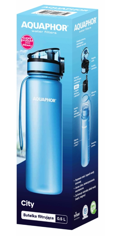 Aquaphor City to butelka dla osób w ciągłym ruchu - wodę masz zawsze pod ręką. Wykonana z wytrzymałego Tritanu, jest bezpieczna dla żywności i całkowicie wolna od BPA, a przy tym odporna na działanie zarówno niskich, jak i wysokich temperatur. Błękitny model wyposażono w wymienny wkład filtrujący, który oczyszcza wodę, nie usuwając jej naturalnych minerałów. Zastosowane aktywowane włókno węglowe redukuje chlor oraz drobne zanieczyszczenia mechaniczne, dzięki czemu poprawia się smak i zapach wody.