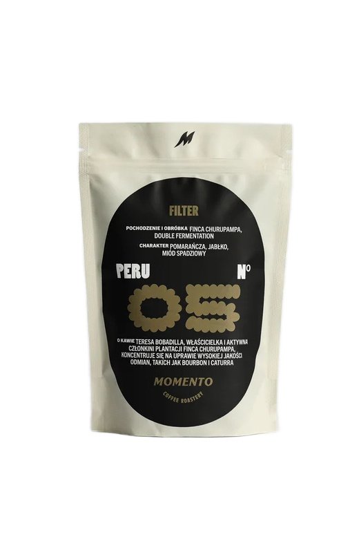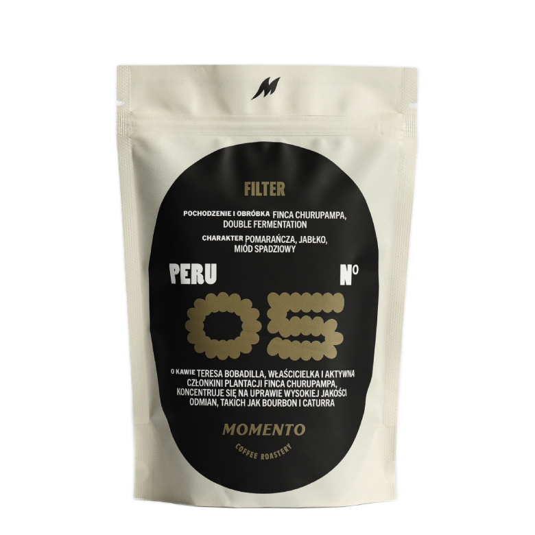 Momento Peru Nº5 Double Washed Fermentation to jasno palona arabika Specialty z Peru, przeznaczona do przelewowych metod parzenia. Ziarna odmiany Bourbon pochodzą z farmy Finca Churupampa w regionie Cajamarca, prowadzonej przez Teresę Bobadilla i jej rodzinę. Uprawiane na wysokości 2000 m n.p.m., poddane zostały wyjątkowej podwójnej fermentacji (36h w wiśni + 24h po depulpingu), co dało im niezwykle czysty i złożony profil. W teście jakości kawa uzyskała 88 punktów SCA.