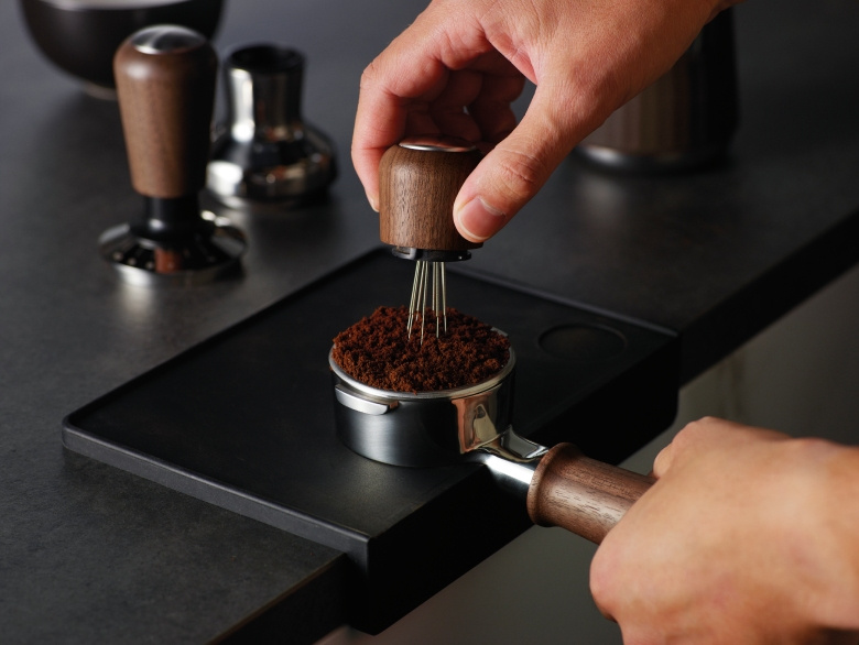8 regulowanych igieł pozwala rozbić grudki i uzyskać równy rozkład kawy w całym koszyku. To zmniejsza ryzyko nierównego przepływu i poprawia powtarzalność ekstrakcji.