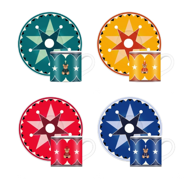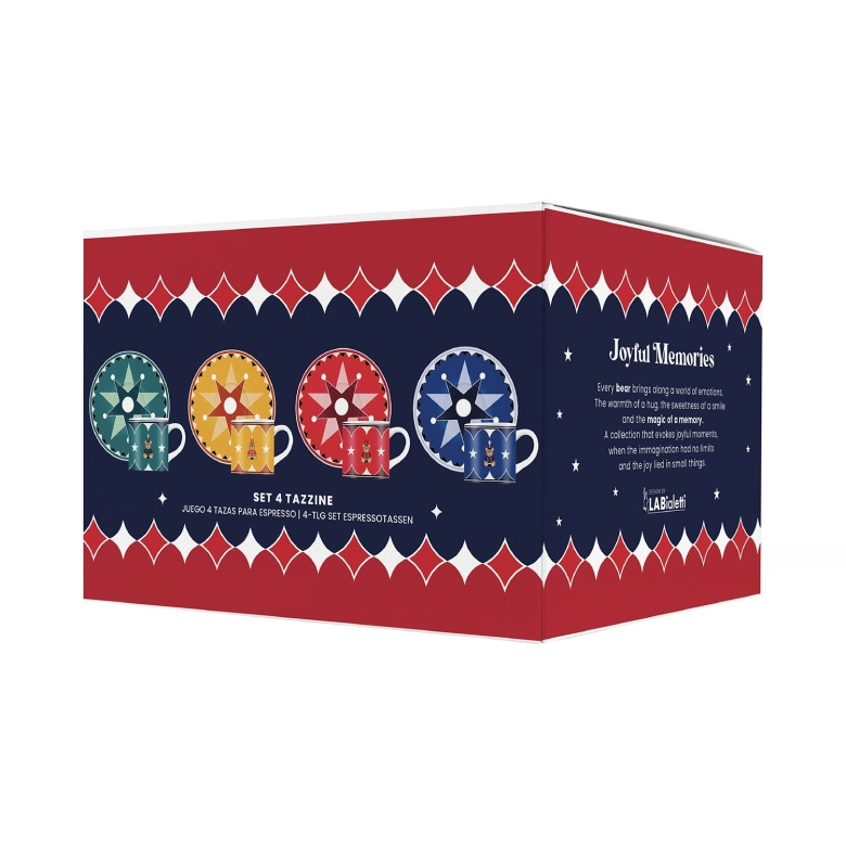 Limitowany komplet czterech filiżanek ze spodkami od Bialetti, stworzony z grubej porcelany i przeznaczony do espresso o pojemnośc 80 ml. Każdy zestaw zawiera cztery różne wzory inspirowane klasycznymi świątecznymi zabawkami - to ukłon w stronę dziecięcej radości i magii Świąt. Idealny prezent dla miłośników włoskiej kawy i świątecznego designu.