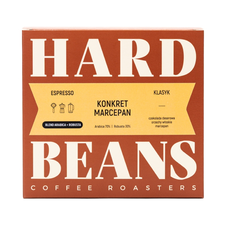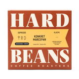 Hard Beans Konkret Marcepan to ciemno palona mieszanka arabiki (70%) i robusty (30%) przeznaczona do ekspresów i kawiarek. Jej ziarna arabiki pochodzą z Peru (Chanchamayo), a robusty z Wietnamu, Indonezji i Ugandy.