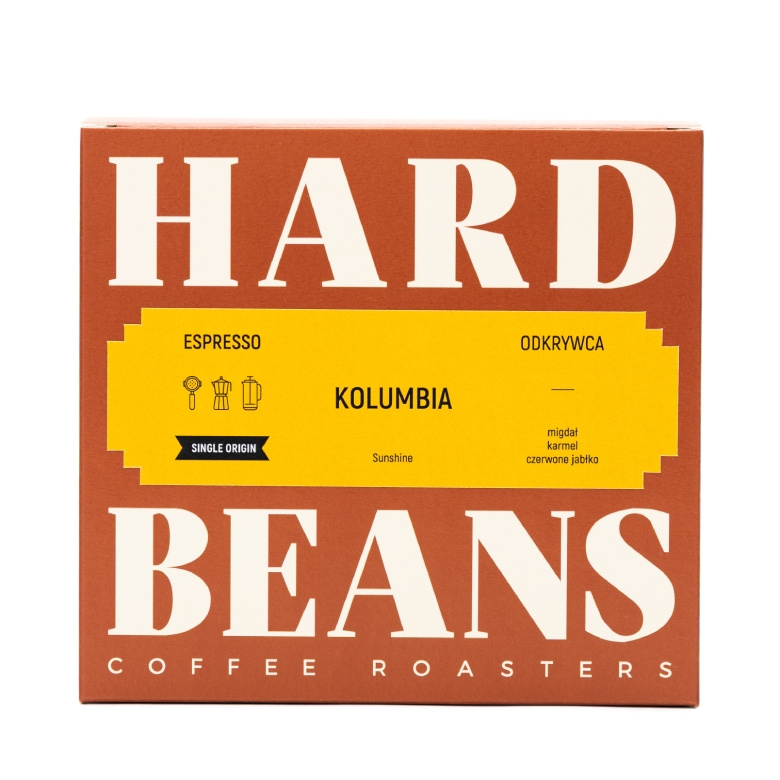 Hard Beans Kolumbia Sunshine to średnio palona arabika z Kolumbii przeznaczona do ekspresów i kawiarek. Jej ziarna odmian Caturra i Tabi uprawiane są na wysokości 1700 m n.p.m. w regionie Palestina (Huila). Kawa została poddana obróbce metodą Washed.