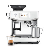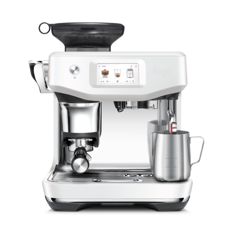 SAGE The Barista Touch Impress SES882SST to profesjonalny ekspres kolbowy w kolorze białym, który łączy intuicyjny ekran dotykowy, automatyczne spienianie Auto MilQ™ i system Impress™ Puck, żeby w domu przygotować kawę jak w kawiarni. Szczotkowana stal korpusu z detalami ze stali nierdzewnej nadaje całości nowoczesny charakter. Solidna kolba 54 mm ze stali, metalowa dysza pary i precyzyjna dźwignia systemu Impress Puck podkreślają wysoką jakość wykonania.