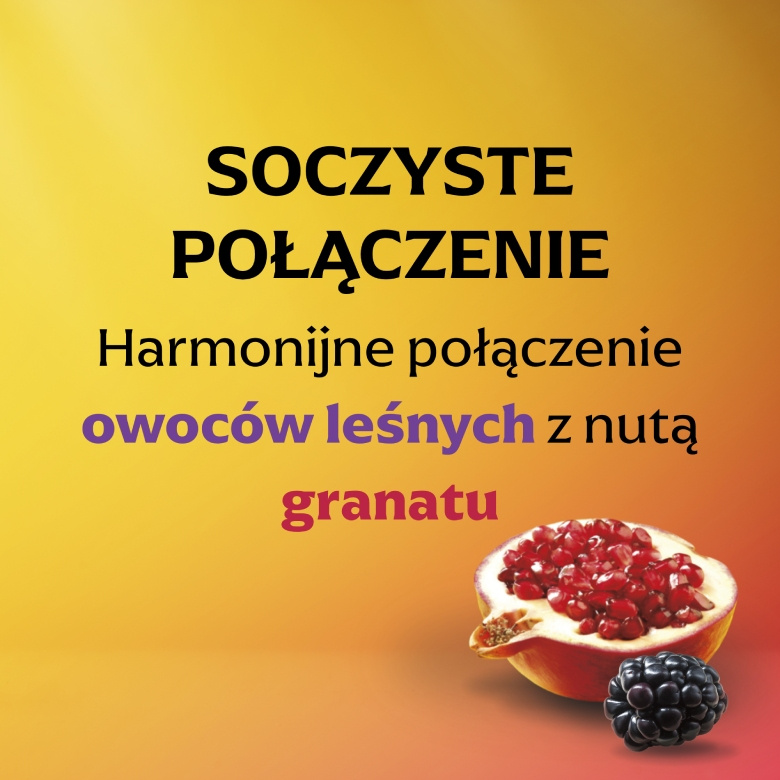 Lipton Owoce Leśne i Granat to aromatyczna herbatka owocowa o pełnym, intensywnym smaku. W tej kompozycji harmonijnie łączą się słodkie owoce leśne z wyraźną, soczystą nutą granatu, tworząc napar pełen naturalnej świeżości i owocowej energii. Każda torebka zawiera 100% składników naturalnego pochodzenia i jest wykonana z materiałów roślinnych. Herbatka naturalnie nie zawiera kofeiny, dzięki czemu możesz cieszyć się jej smakiem o każdej porze dnia.
