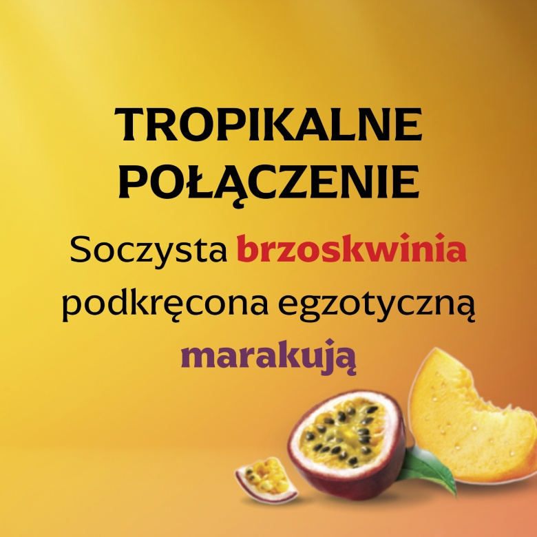 Lipton Brzoskwinia i Marakuja to tropikalna herbatka owocowa, która zachwyca słodyczą dojrzałej brzoskwini oraz wyrazistym, egzotycznym akcentem marakui. Ta pełna energii, soczysta kompozycja powstaje z 100% składników naturalnego pochodzenia i jest zapakowana w torebki roślinnego pochodzenia. Herbatka naturalnie nie zawiera kofeiny, dlatego możesz sięgać po nią zawsze, gdy masz ochotę na owocową chwilę przyjemności.