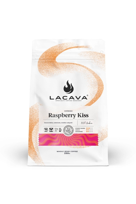 LaCava Raspberry Kiss to sezonowy blend espresso wypalony w sposób średni, złożony w 100% z arabiki jakości Specialty. W paczce znajdziesz ziarna z Brazylii (Mogiana Santa Rita, obróbka natural) oraz Etiopii (Limu, obróbka natural). Połączenie tych dwóch kaw daje espresso słodkie, owocowe i bardzo zbalansowane, z przyjemnie delikatną kwasowością. Ziarna uzyskały 83 punkty w ocenie jakości.