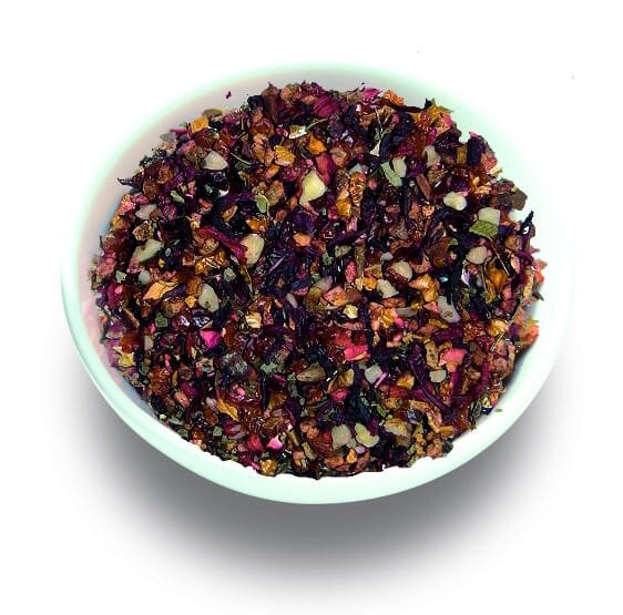 Skład: hibiskus, kawałki jabłek, skórki dzikiej róży, liście słodkich jeżyn, kawałki cynamonu, aromaty, kawałki malin, skórka pomarańczy, płatki róży.