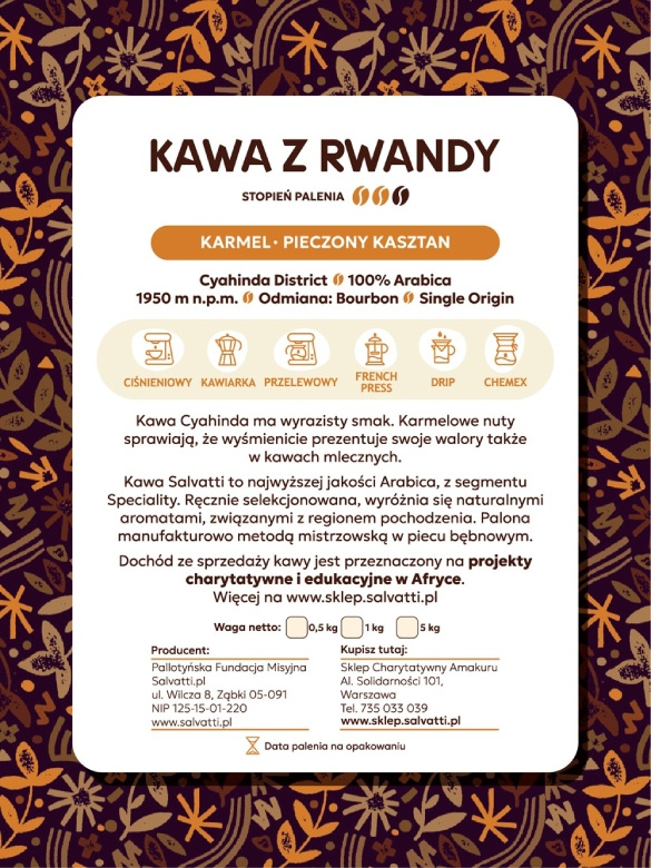 Salvatti Cyahinda to kawa, która doskonale sprawdzi się do przygotowania w zaparzaczu drip lub Chemex, ale także w ekspresach automatycznych oraz kolbowych. Zachwyci miłośników zarówno kaw czarnych, jak i mlecznych.