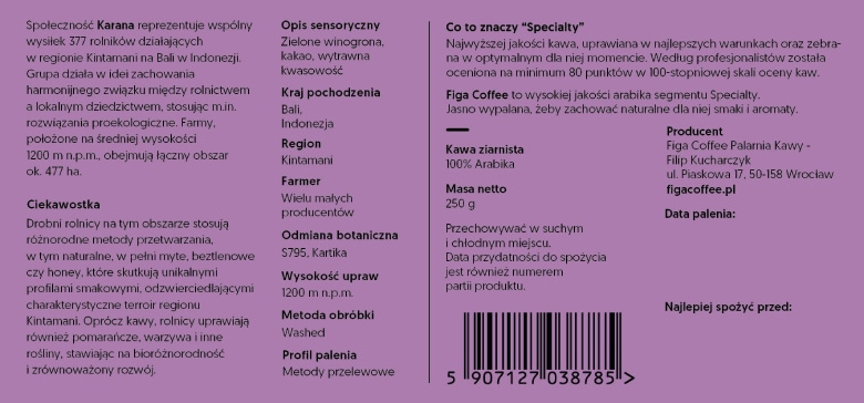 Figa Coffee Bali Karana to jasno palona arabika specialty z Indonezji, przeznaczona do metod przelewowych. Ziarna pochodzą z regionu Kintamani na wyspie Bali i są efektem współpracy społeczności Karana, zrzeszającej wielu małych producentów. Kawy uprawiane są na wysokości około 1200 m n.p.m., z odmian botanicznych S795 oraz Kartika, a następnie poddawane klasycznej obróbce washed, która podkreśla czystość i przejrzystość profilu.