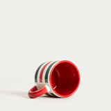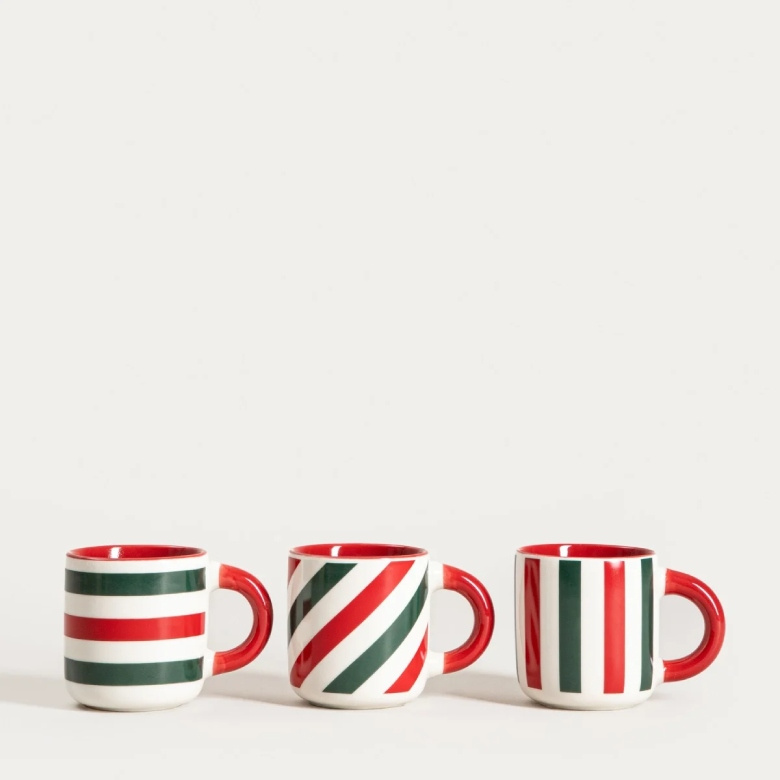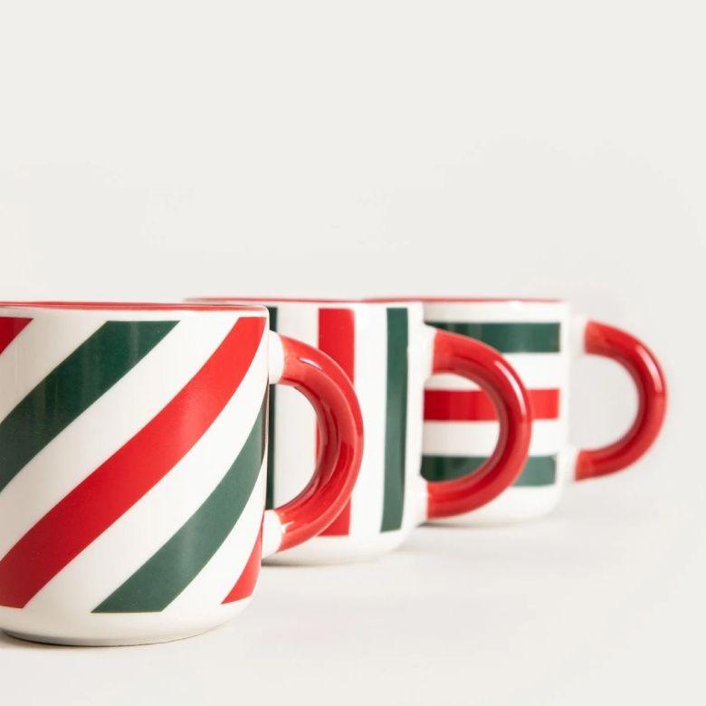 Kubki zdobią czerwono-zielone paski, a całość dopełniają ozdobne czerwone uszka. To drobny detal, który robi klimat na stole, szczególnie w zimowym sezonie i podczas spotkań przy kawie.