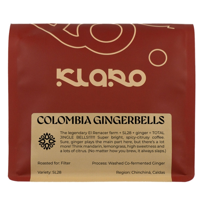Klaro Kolumbia GINGERBELLS to jasno palona kawa Specialty z Kolumbii stworzona z myślą o metodach przelewowych. Ziarna odmiany SL28 pochodzą z legendarnej farmy El Renacer w regionie Chinchiná (Caldas), gdzie rosną na wsyokości 1400-1600 m n.p.m. Kawa została poddana innowacyjnej obróbce washed co-fermented z imbirem.