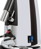 Obudowa młynka jest zrobiona z aluminium i dodatkowo została pokryta chromem, a płaskie żarna o średnicy 58 mm zostały skonstruowane ze stali, a plastikowy pojemnik na kawę może pomieścić aż 500 g ziaren. Rozpoczęcie mielenia następuje po wciśnięciu czerwonego guzika znajdującego się tuż pod wylotem kawy, która ląduje bezpośrednio do kolby. Przy wysypie kawy znajduje się potencjometr, za pomocą którego możemy ustawić czas mielenia.