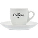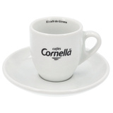 Porcelanowa filiżanka ze spodkiem, która jest przeznaczona do kawy espresso. Filiżanka z logo hiszpańskiej palarni kawy Cornella jest wykonana z grubej porcelany, dzięki czemu doskonale utrzymuje temperaturę podawanej w niej kawy. Filiżanka do espresso ma elegancki design i posiada ucho, które zapewnia wygodę użytkowania. Pojemność filiżanki wynosi 55 ml, co sprawia, że zmieścimy w niej pojedynczą porcję espresso.