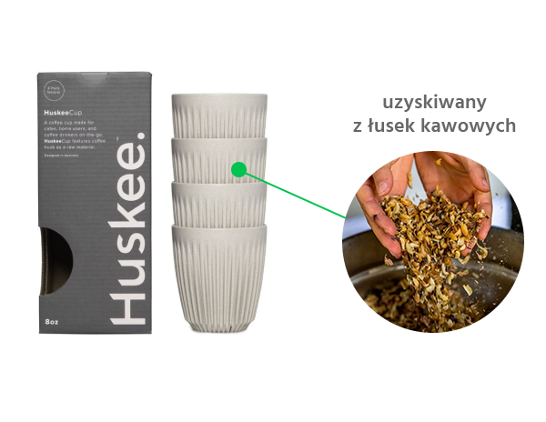 Zestaw 4 niezwykle wygodnych i atrakcyjnych kubów do kawy Huskee w kolorze Natural to doskonała propozycja dla każdego kawosza, który posiada duszę ekologa. Kubek Huskee jest wykonany z łusek kawowych (ang. coffee husk). Surowiec ten powstaje podczas procesu mielenia kawy, a następnie jest wykorzystywany do stworzenia tego wyjątkowego kubka. Dzięki temu odpad jest wykorzystywany ponownie.