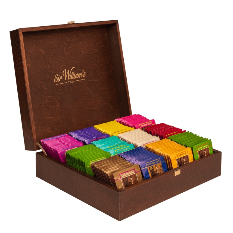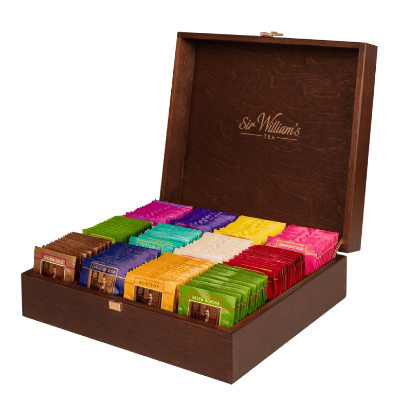 Drewniana skrzynka na herbatę Sir William's, zawiera 180 saszetek z wysokiej jakości herbatą marki Sir William's. 12 smaków herbat (czyli tyle, ile przegródek znajduje się w skrzynce) pakowanych po 15 saszetek to doskonały zestaw dla miłośnika herbaty. Skrzynka pełna herbat sprawdzi się jako prezent dla najbliższej osoby i z pewnością znajdzie swoje zastosowanie w lokalach gastronomicznych.