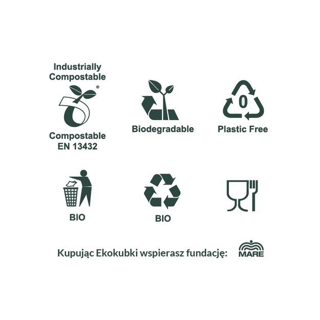 Ekologiczne kubki do kawy zostały wykonane z pulpy celulozowej pozyskiwanej z odnawialnych surowców pochodzenia roślinnego i posiadają również biodegradowalną powłokę z polimeru. Biodegradowalne kubki do kawy świetnie sprawdzą się w naszych kawiarniach, barach i restauracjach, jako ekologiczne kubki na wynos. Kubek o pojemności 400 ml może nam posłużyć do podania kawy czarnej, mlecznej, ale także herbaty i gorącej czekolady. Jeden rękaw zawiera 50 sztuk ekologicznych kubków do kawy. Kubki są w 100% biodegradowalne i posiadają certyfikat biodegradowalności DIN Certco. Kupując ekologiczne kubki do kawy możemy przyczynić się do ochrony środowiska.