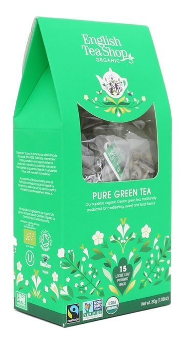 Wysokiej jakości zielona herbata English Tea Shop Pure Green Tea pochodzi z uprawy ekologicznej. Opakowanie zawiera 15 piramidek, gdzie wygoda herbaty w torebce łączy się ze smakiem suszu zaparzanego w koszyczku.