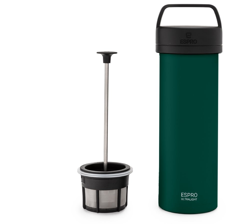 Espro Ultralight Coffee Press to doskonałe połączenie zaparzacza French Press z podróżnym kubkiem termicznym. Został stworzony z myślą o podróżnikach, którzy kochają wyśmienitą kawę. Zielony zaparzacz Espro Ultralight Coffee Press działa, jak klasyczny French Press, ale jest wyjątkowo smukły i posiada tłok z podwójnym filtrem, który dzięki drobnym otworom (9-12 razy drobniejsze, niż zwykły French Press) gwarantuje wyjątkowo klarowny napar pozbawiony fusów.