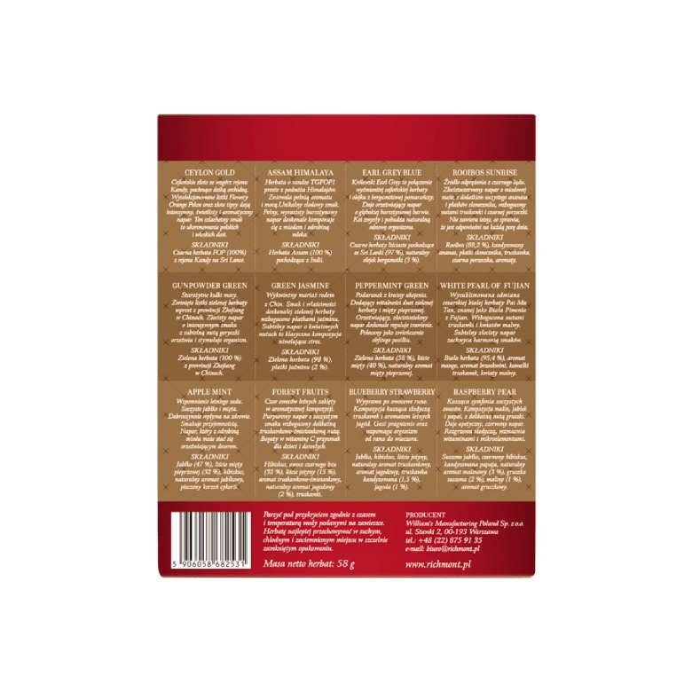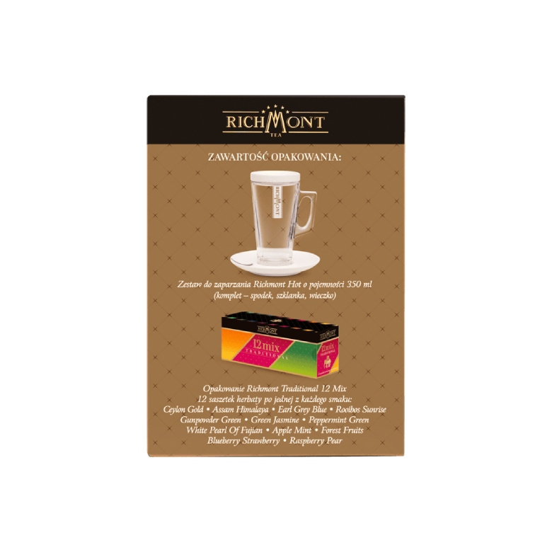 Richmont 12 Traditional Mix to doskonała propozycja dla miłośników herbat najwyższej jakości. Zestaw zawiera 12 herbat Richmont różnych smaków, dzięki czemu doskonale możemy poznać smak każdej z nich. W zestawie znajdziemy saszetki z herbatą czarną, herbatą zieloną, herbatą białą, ziołową i owocową, dlatego każdy znajdzie w nim coś dla siebie.