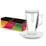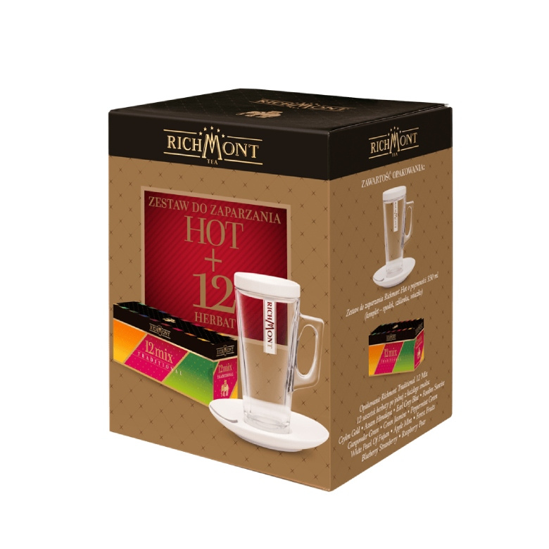 Zestaw, który doskonale posłuży jako prezent dla bliskiej osoby. W skład zestawu wchodzi szklanka do parzenia herbaty oraz 12 herbat w saszetkach Richmont. Szklanka o pojemności 400 ml posiada spodek i wieczko, które pozwala na dłużej utrzymać temperaturę zaparzonej herbaty.
