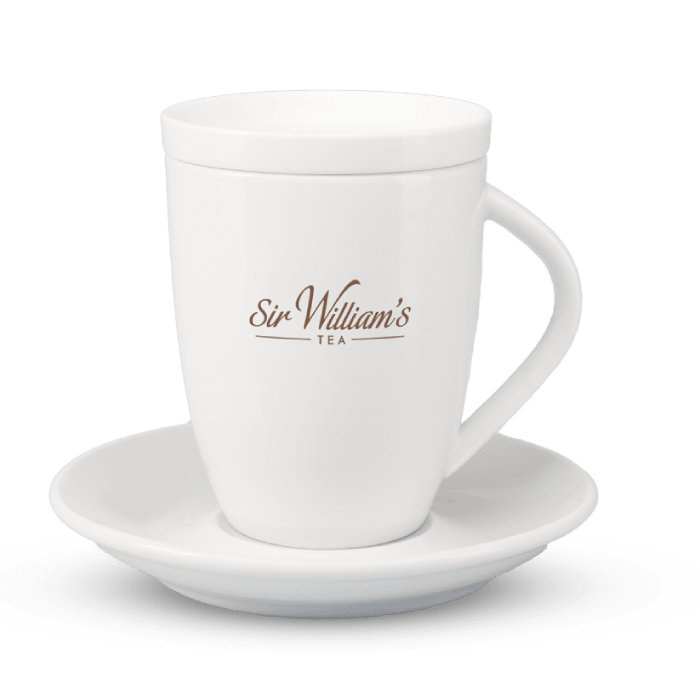Porcelanowy kubek, który doskonale posłuży jako prezent dla miłośnika herbacianych naparów. Kubek z logo Sir William's posiada spodek oraz wieczko, które na dłużej utrzymuje temperaturę zaparzonej w nim herbaty oraz może służyć jako miejsce na zaparzoną saszetkę.