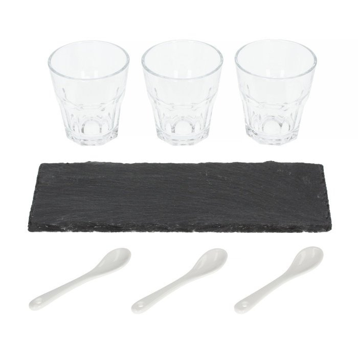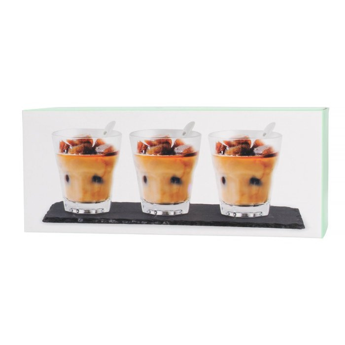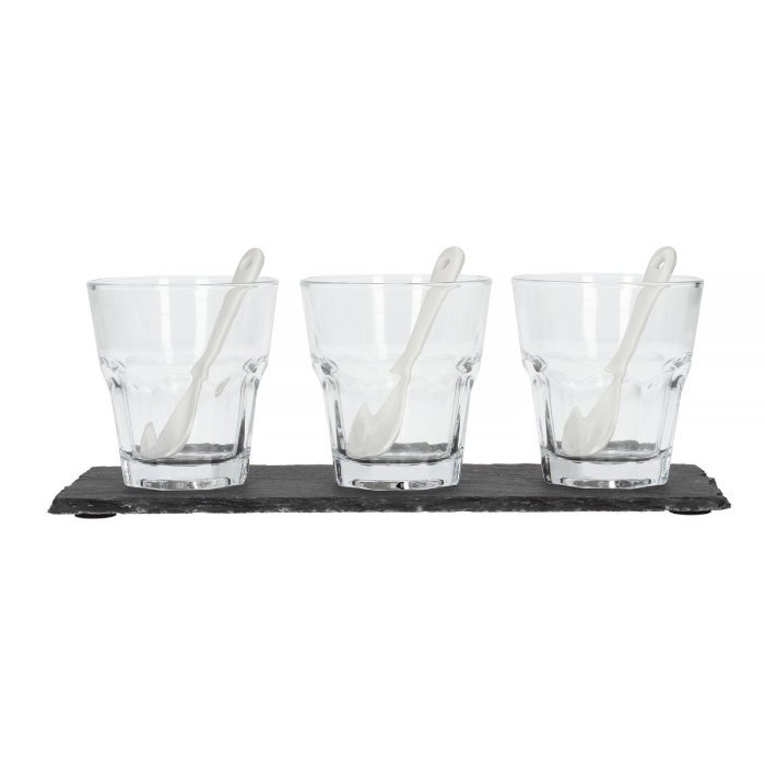 Zestaw 3 szklanek do kawy Bialetti Iced Coffee. Przezroczyste szklanki wykonane są z grubego szkła i doskonale sprawdzą się do podania mrożonej kawy. W zestawie ze szklankami znajdziemy również ceramiczne łyżeczki oraz elegancką kamienną podstawkę.