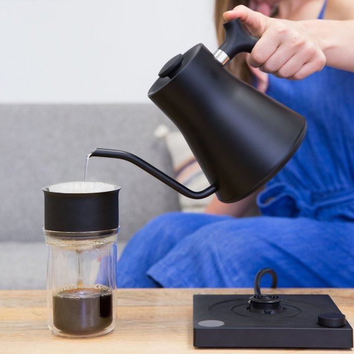 Fellow Stagg EKG to elektryczny czajnik, który doskonale sprawdzi się do alternatywnych metod parzenia. Czajnik został wykonany ze stali nierdzewnej 304 18/8 i jest pokryty farbą, która jest bezpieczna w kontakcie z żywnością. Fellow Stagg EKG daje nam możliwość ustawienia temperatury podgrzewanej wody w zakresie od 40°C do 100°C za pomocą wygodnego pokrętła. Podstawka czajnika jest wyposażona w wyświetlacz LCD ze stoperem, który pozwala mierzyć czas parzonej kawy.