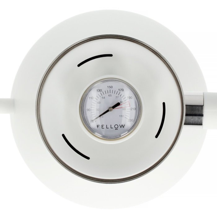 Fellow Stagg Kettle to elegancki czajnik do kawy, który doskonale sprawdzi się do alternatywnych metod parzenia. Biała konewka do kawy została wykonana ze stali nierdzewnej 304 18/8 i pokryta farbą, która jest bezpieczna w kontakcie z żywnością. Czajnik Fellow Stagg Kettle posiada przykrywkę ze wbudowanym termometrem, dzięki czemu mamy pełną kontrolę nad przechowywaną w nim wodą.