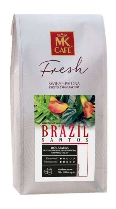 Kawa ziarnista MK Cafe Fresh Brazylia Santos to arabika Single Origin, która najlepiej sprawdzi się jako aromatyczne espresso lub delikatna kawa z mlekiem.