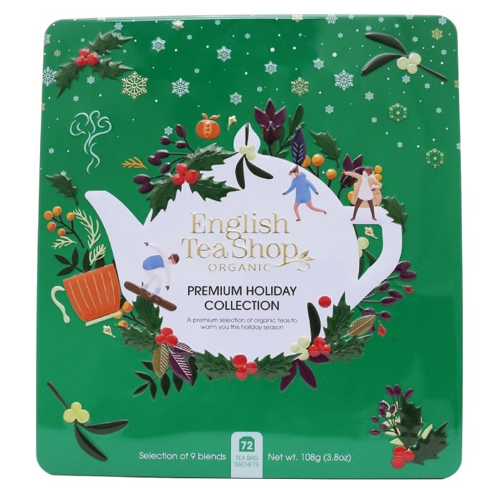 English Tea Shop Premium Holiday Collection Green to zestaw prezentowy zawierający świąteczne herbaty w saszetkach. Metalowa puszka zawiera 72 saszetek z herbatą w 9 smakach. Każda z nich jest mieszanką organicznej herbaty czarnej i zielonej z ziołami, przyprawami i owocami. Kolekcja herbat English Tea Shop Premium Holiday Collection Green rozbudzi w nas świąteczną atmosferę i świetnie sprawdzi się jako prezent dla bliskiej osoby.